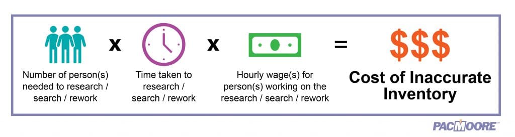 Number of Person(s) needed to research/search/rework [multiplied by] length of time taken to research/search/rework [multiplied by] hourly wage(s) for person(s) working on the research/search/rework [equals] the cost of inaccurate inventory.